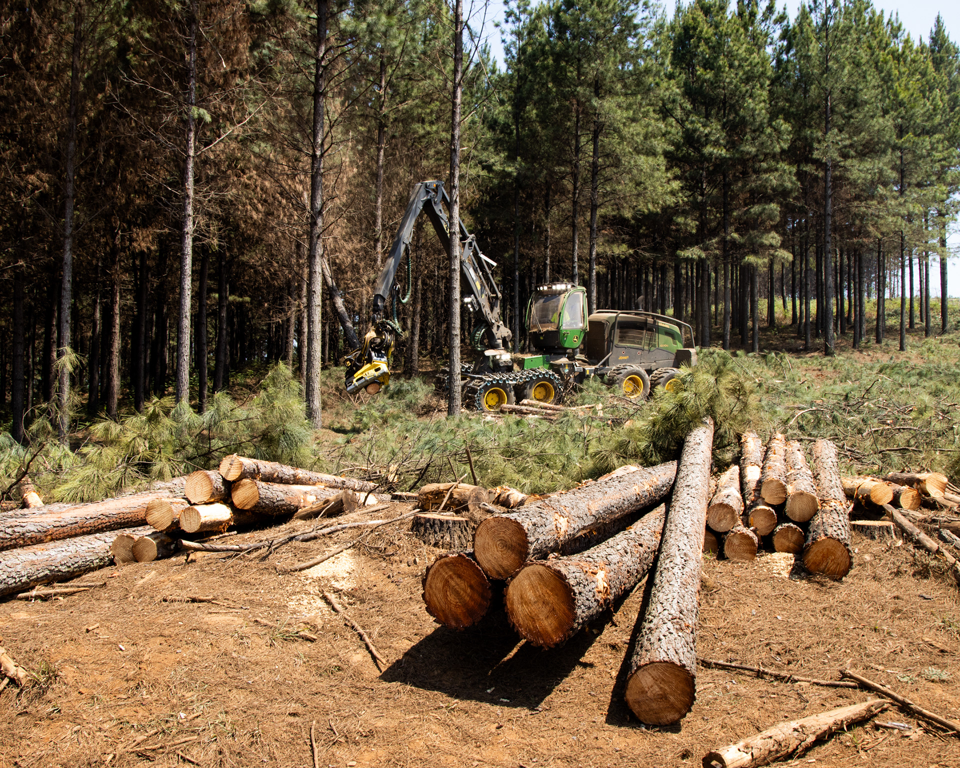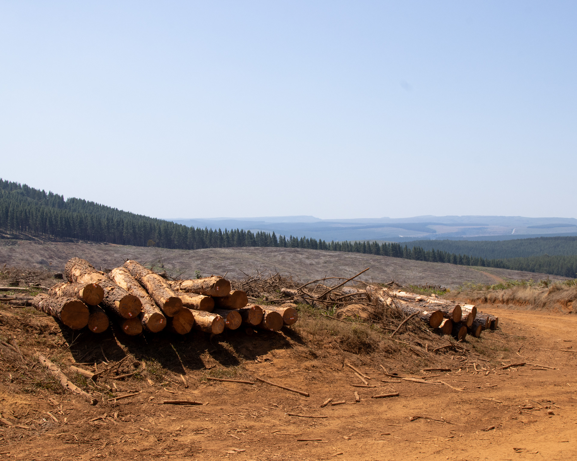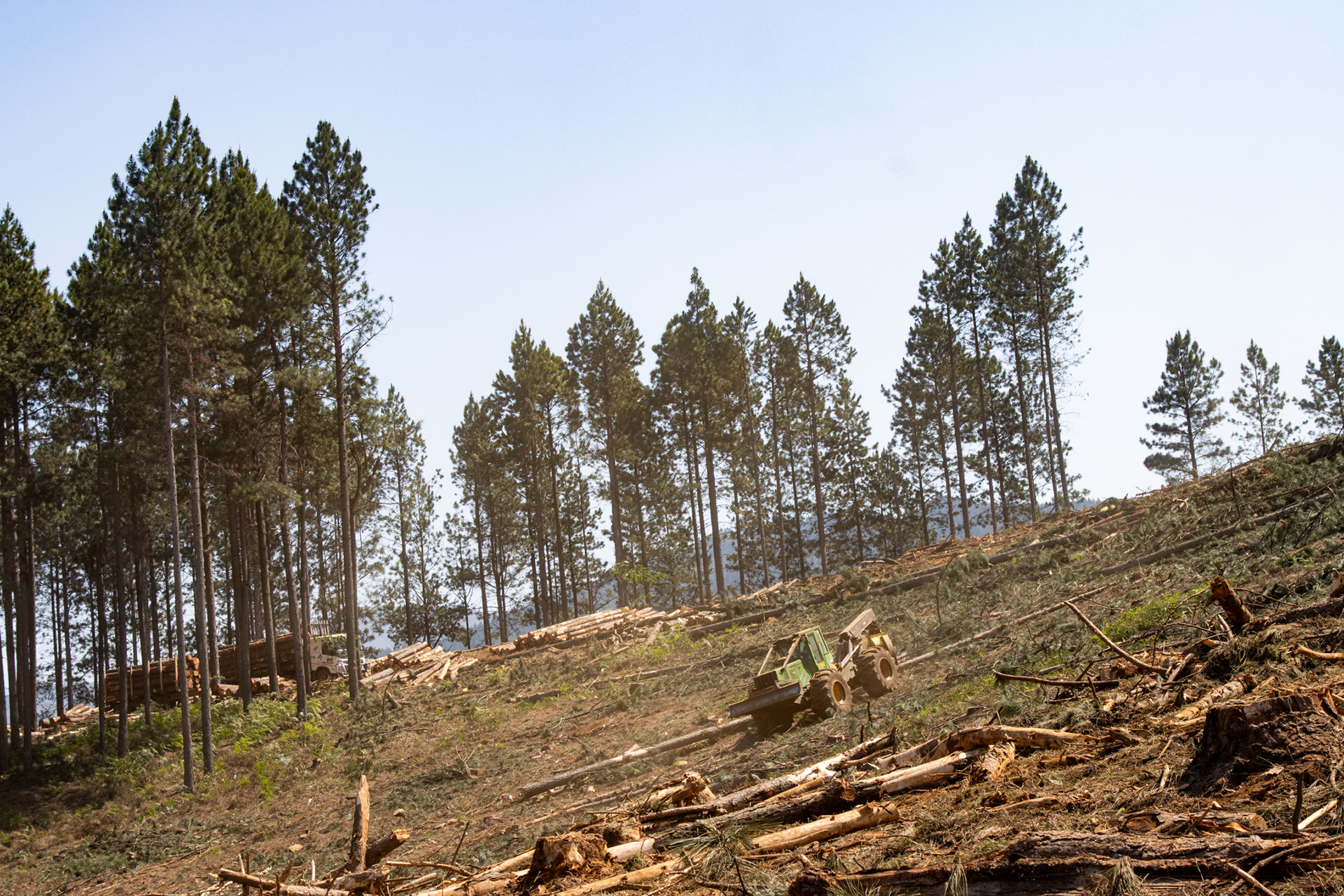 At maturity the trees are felled. This is either done by hand by a forestry team, or mechanically by a logging machine. Logs are then either carried out the plantation by staff or timber hitch, and stacked along the road where they’ll be loaded onto a truck.