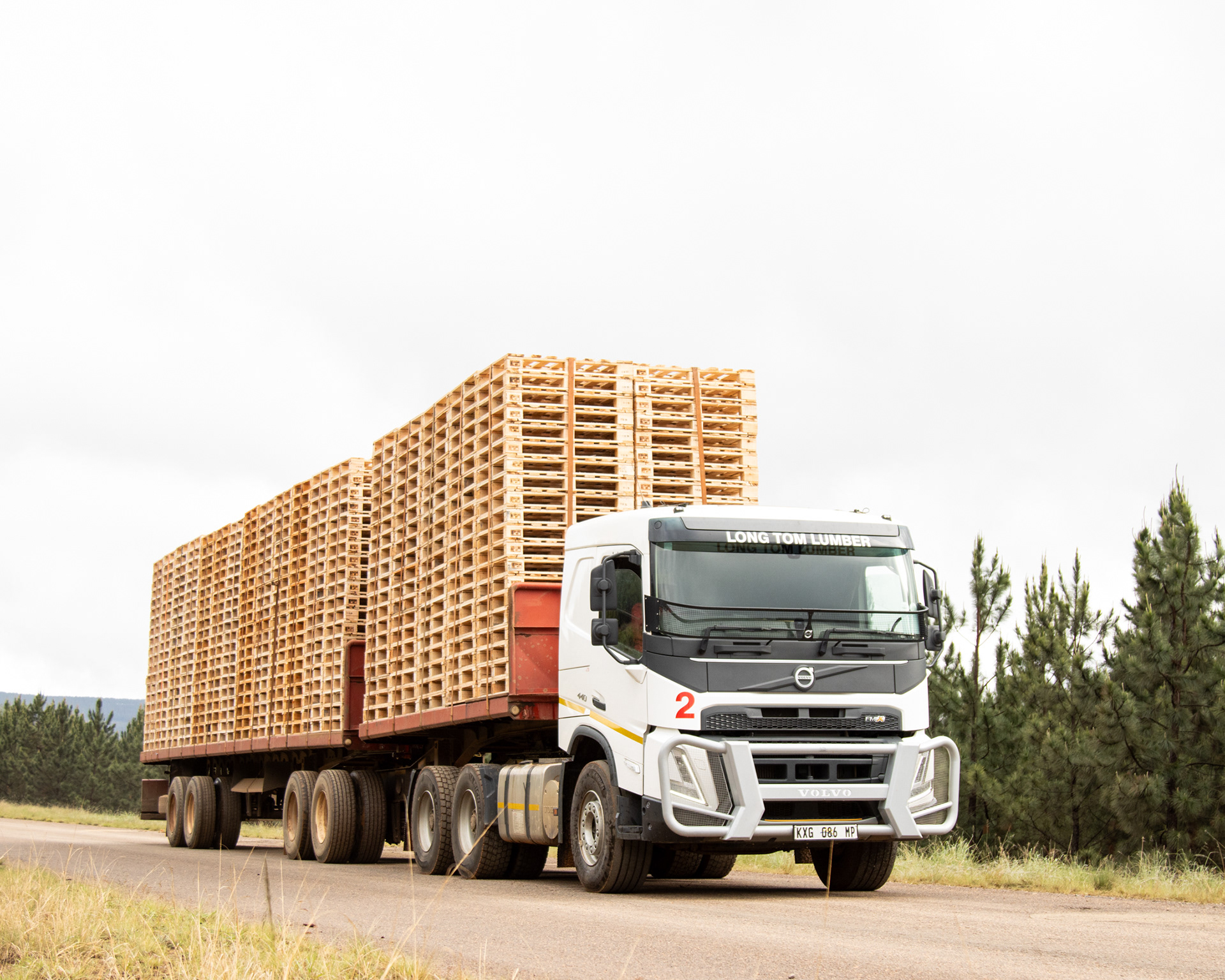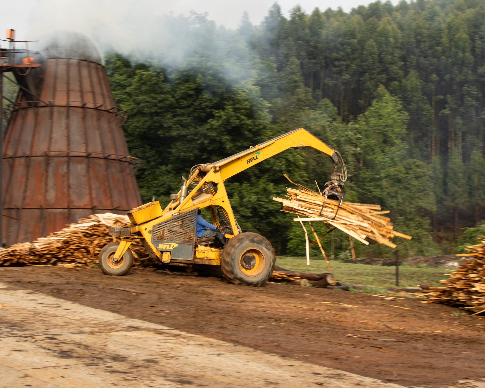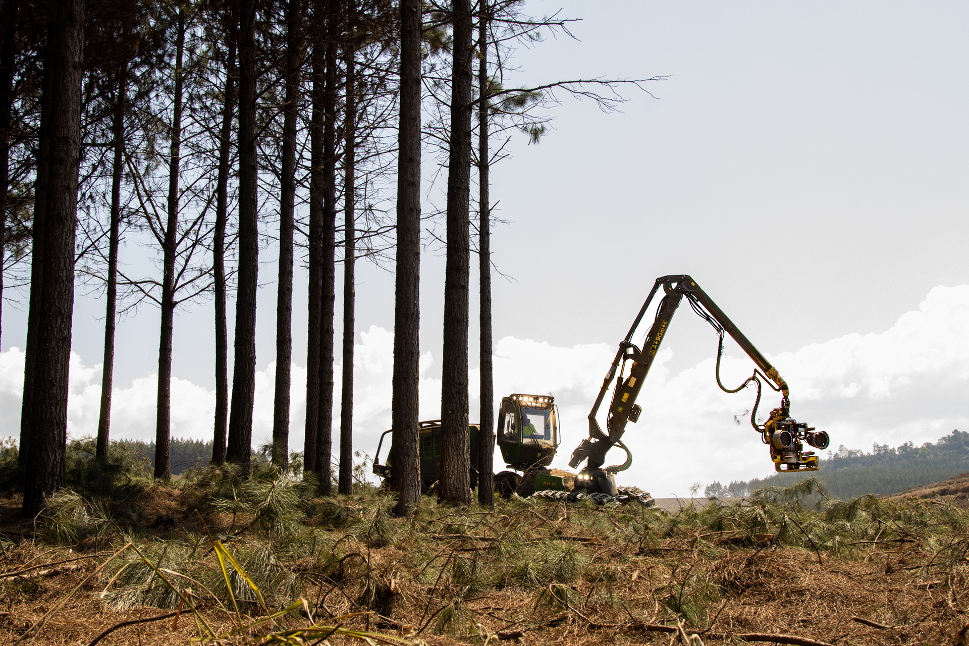 At maturity the trees are felled. This is either done by hand by a forestry team, or mechanically by a logging machine. Logs are then either carried out the plantation by staff or timber hitch, and stacked along the road where they’ll be loaded onto a truck.